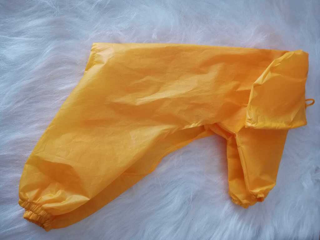 Capa de chuva para pet, em plástico, com zíper nas costas, barbante no capuz, elástico no abdome e patinhas, botões na altura do tórax e abdome.