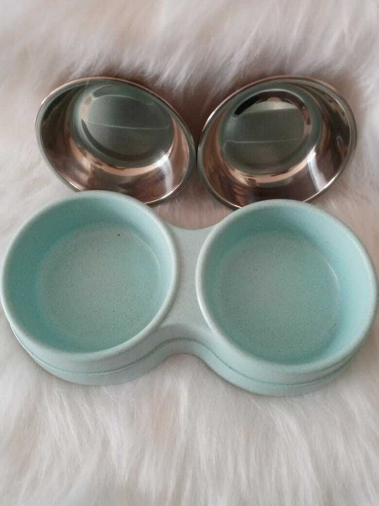 Comedouro duplo para cães e gatos, em plástico e inox, parte de inox removível, facilitando a higiêne.